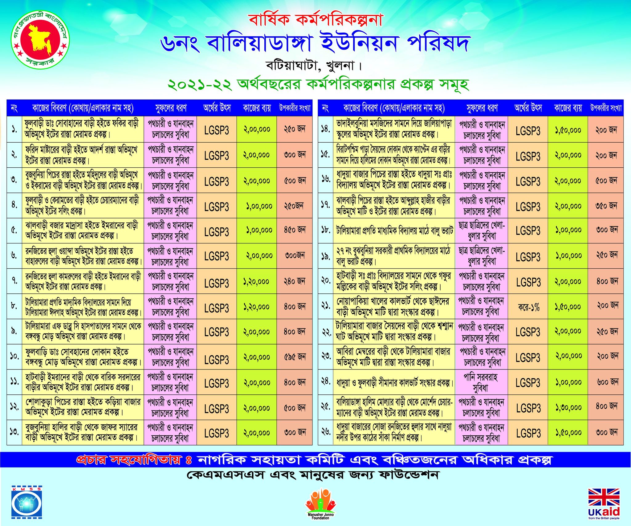 | ক. রাস্তাঘাটমেরমত/ এলজিএসপি | ১৬০০০০/= | ২. বিবিধ | ২১,৬০০/= |